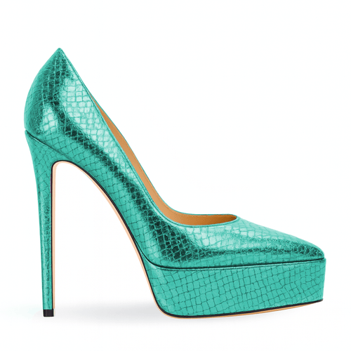 Pointed toe pumps with snake-effect laminated upper, 3.5cm platform, and 13cm heel
