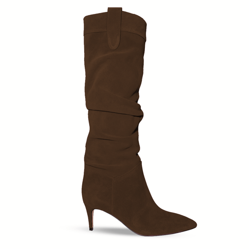 Tubular boot with pointed toe in suede with folds and 70mm heel