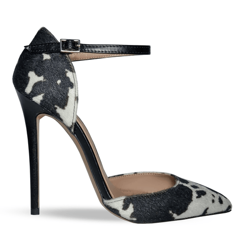 Closed-toe sandal in cow print with adjustable ankle strap, stiletto heel of 80mm, 100mm, or 120mm