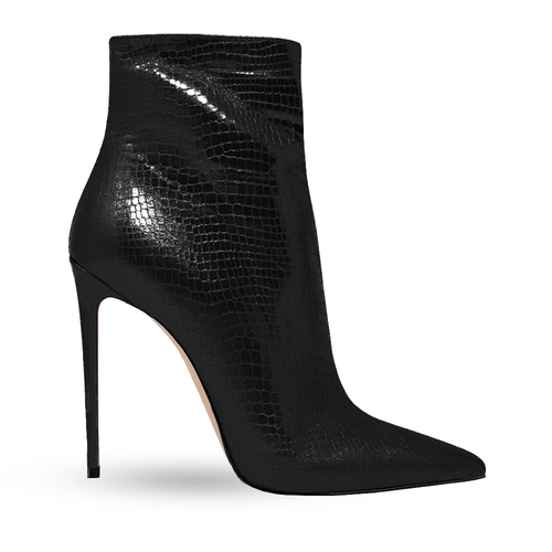 Stivaletto a punta sfilata in pelle laminata effetto serpente con zip laterale e tacco a spillo da 100mm o 120mm